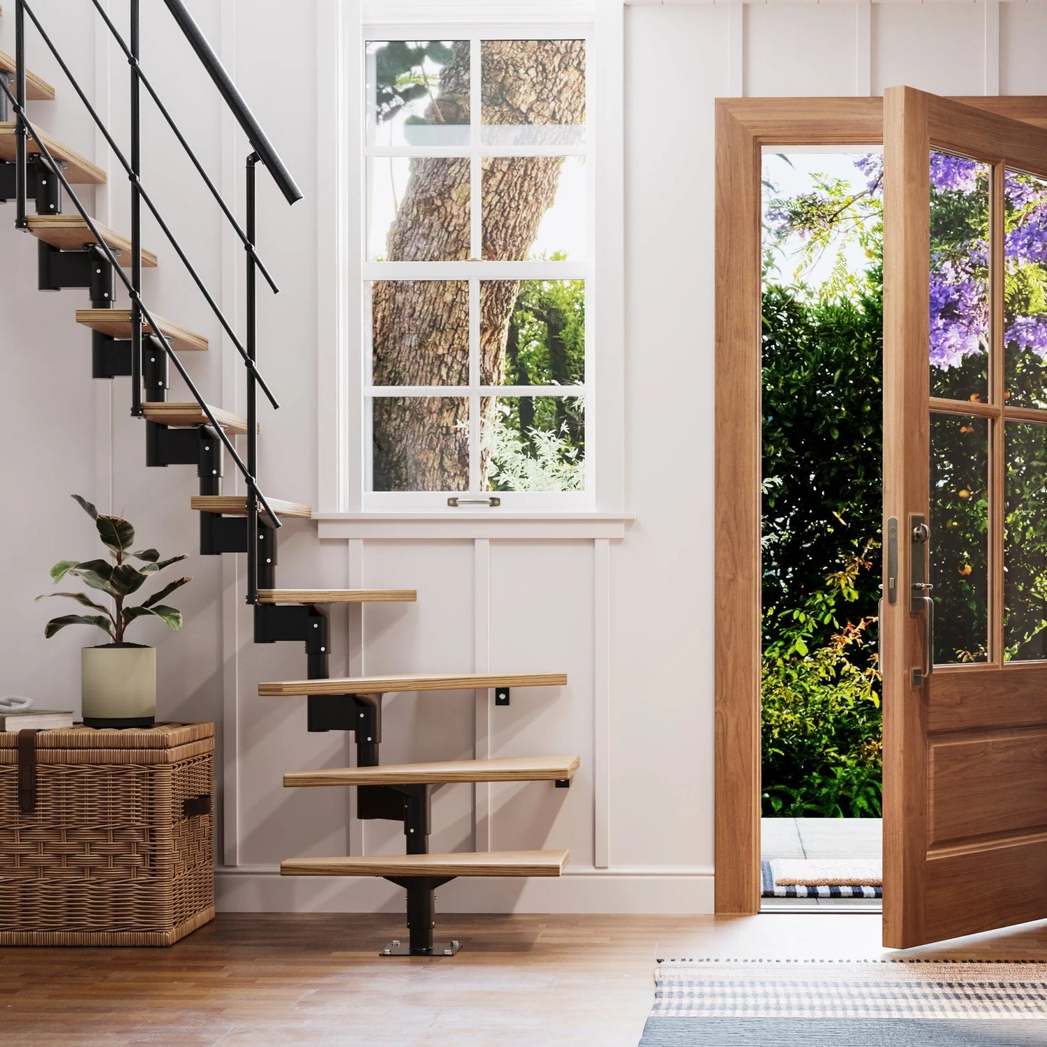 Look no further for the perfect mix of modern and classic. The dramatic quarter-turn layout of the LYON modular staircase is sure to turn heads. The sleek beechwood treads and matching handrail provide a warm feel for your space while the black risers and infill keeps the design modern and trendy.